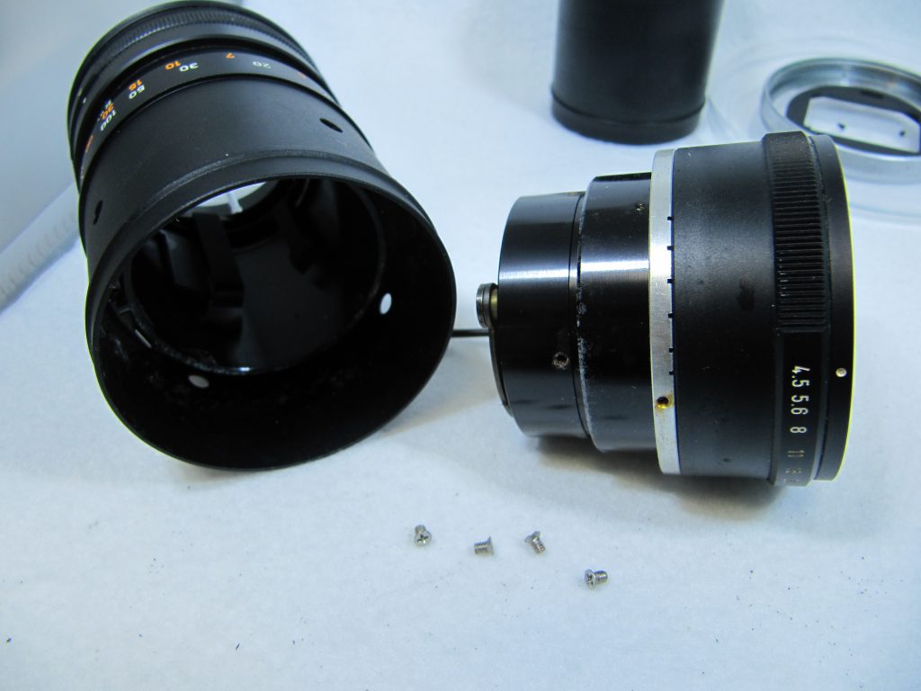 分解清掃したいと思います。まず、鏡筒横のイモネジを1本外します。