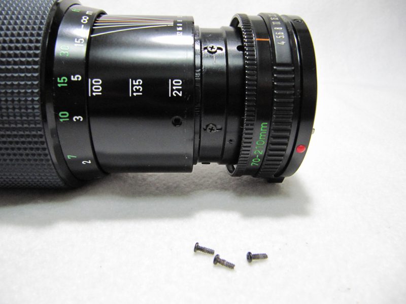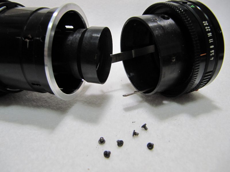 その下の、ネジ6本を外します。マウントと絞りリングがごっそりと外れます。