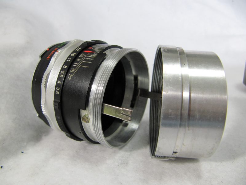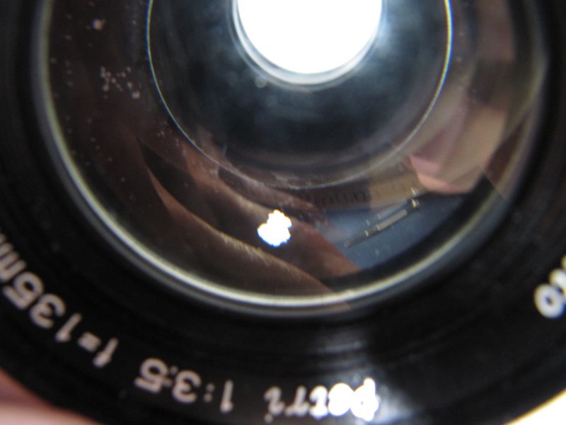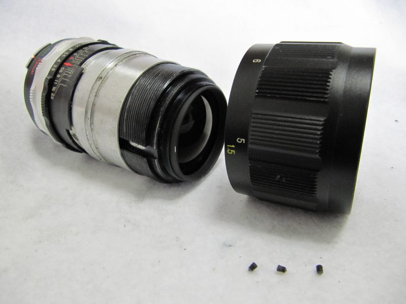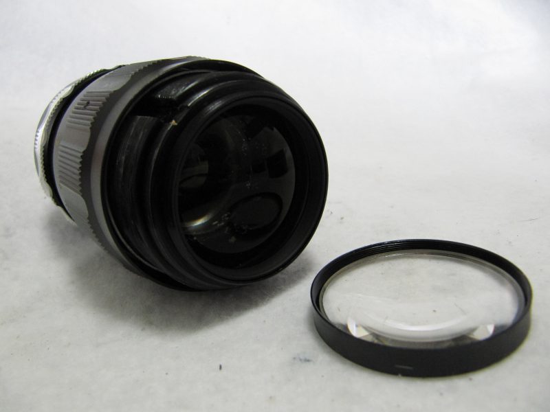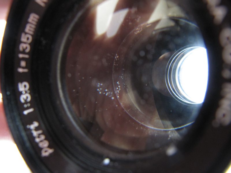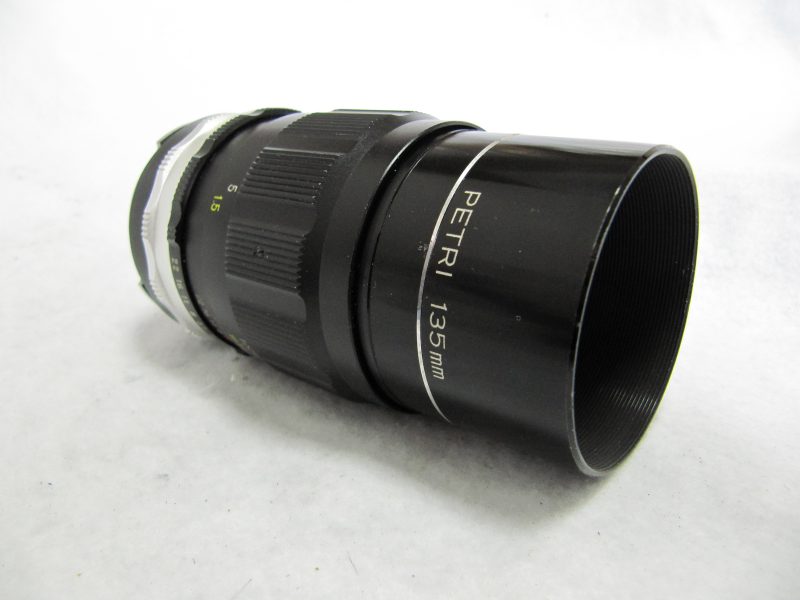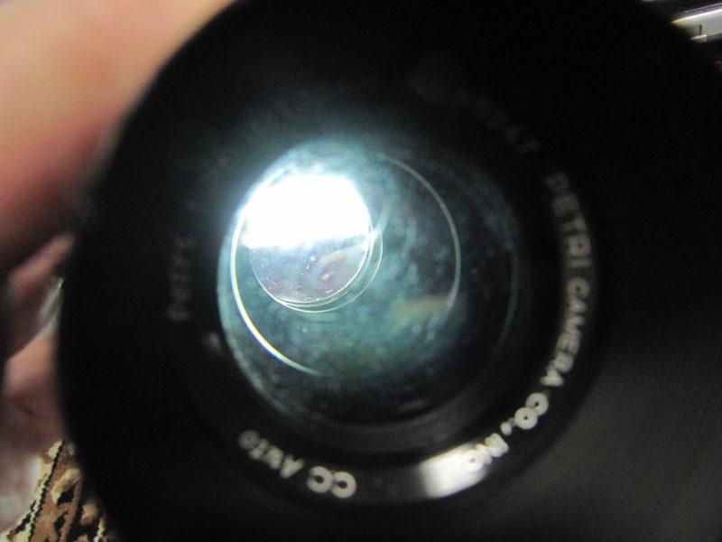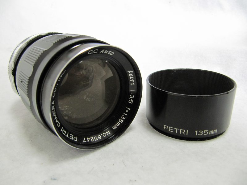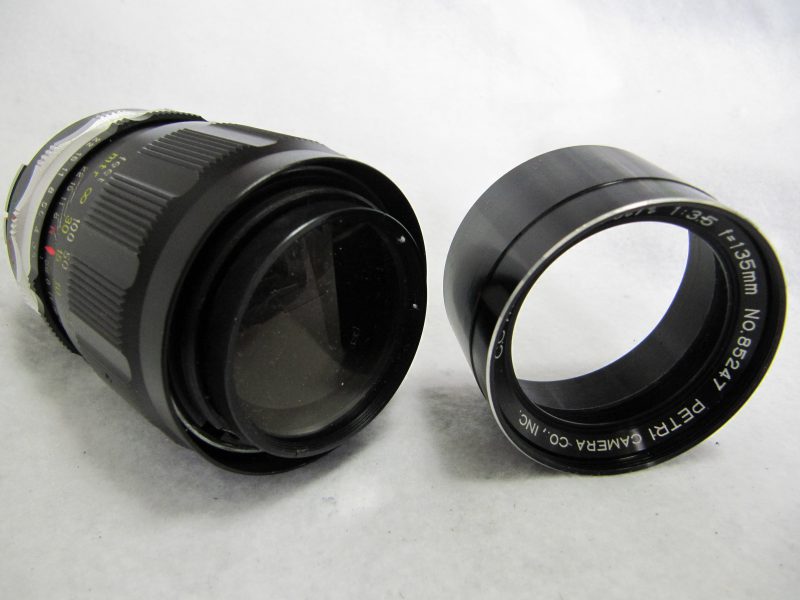 540円のジャンクで見つけた PETRI 135mm F3.5 CC Auto です。レンズ内部はかなり汚れています。コパ切れなのか、鏡筒内部が剥げているのか、かなり傷んで見えます。ヘリコイドの回転もかなり重いです。ねじ込み式のフードが付いています。