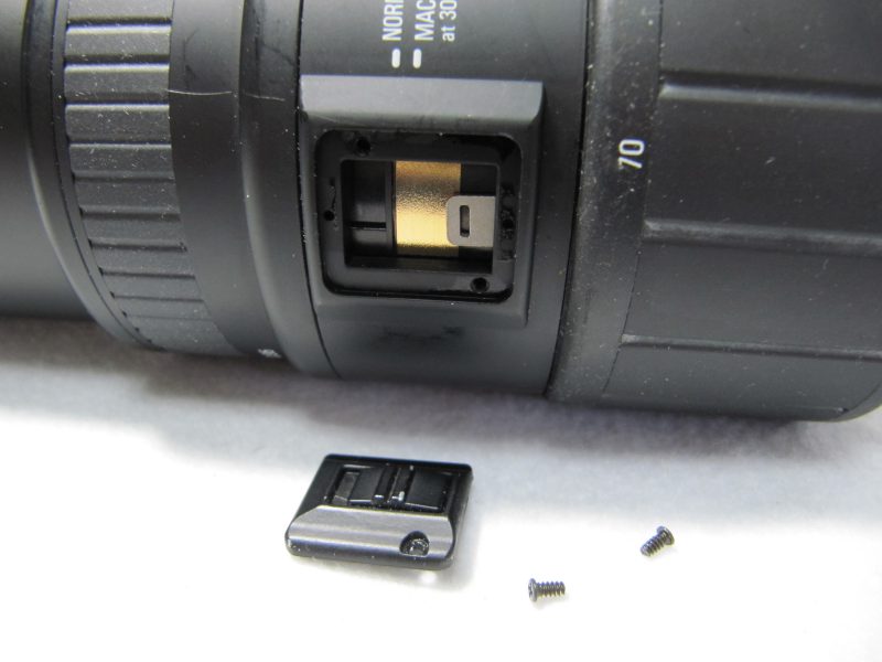 このレンズは、いろいろな形のものがりますが、この比較的古い型のマクロスイッチが外から外せるタイプのものが、この改造には便利です。これより後のタイプのものは内部を分解しないといけないので面倒です。